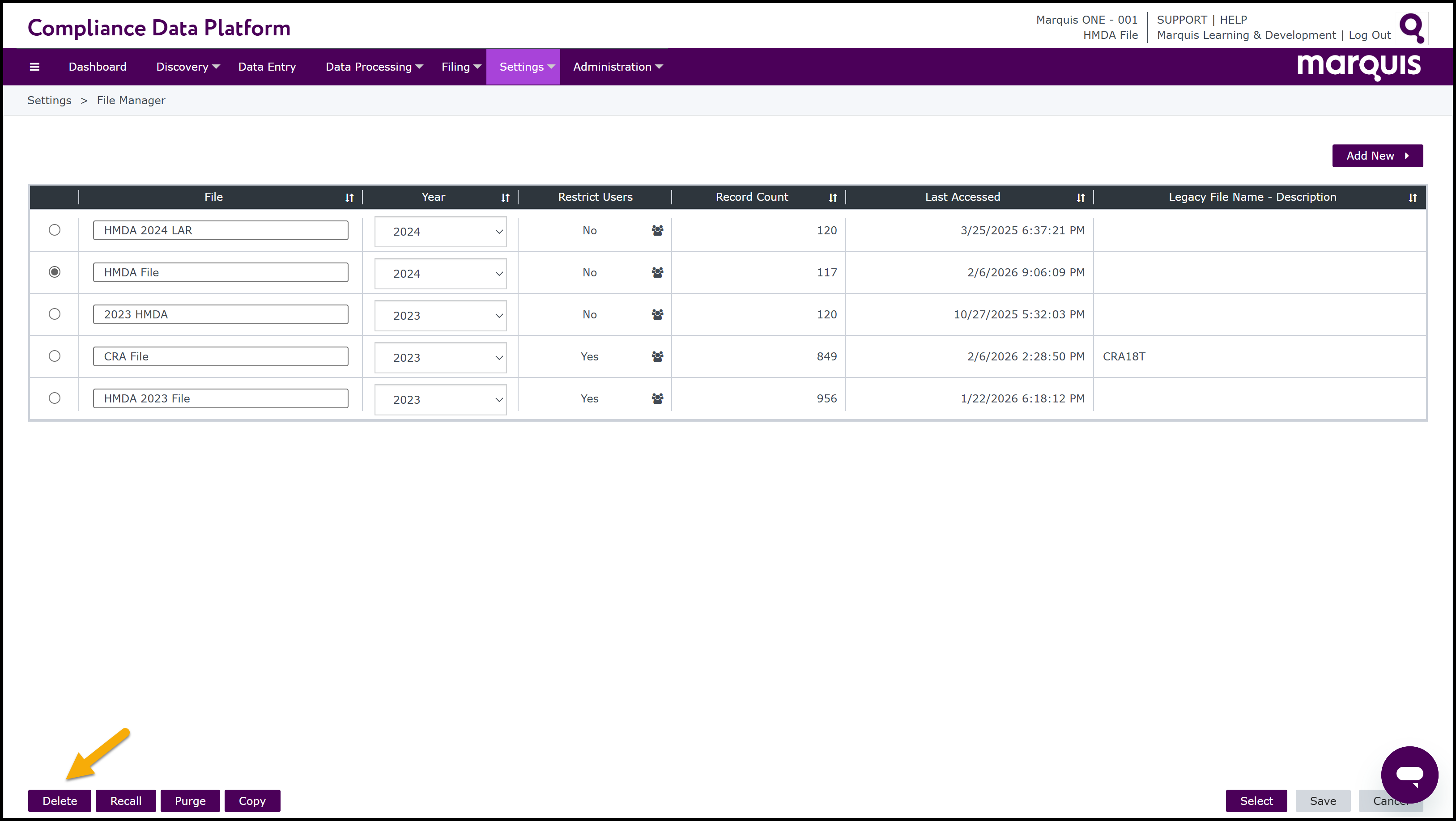 A previous year's file, previous import template, and/or records can all be deleted in the Compliance Data Platform.