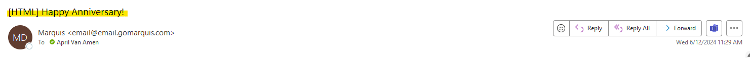 Sample email has [HTML] in the Subject line The bracketed HTML tag only appears on sample emails, and it will not show on the launched email.
