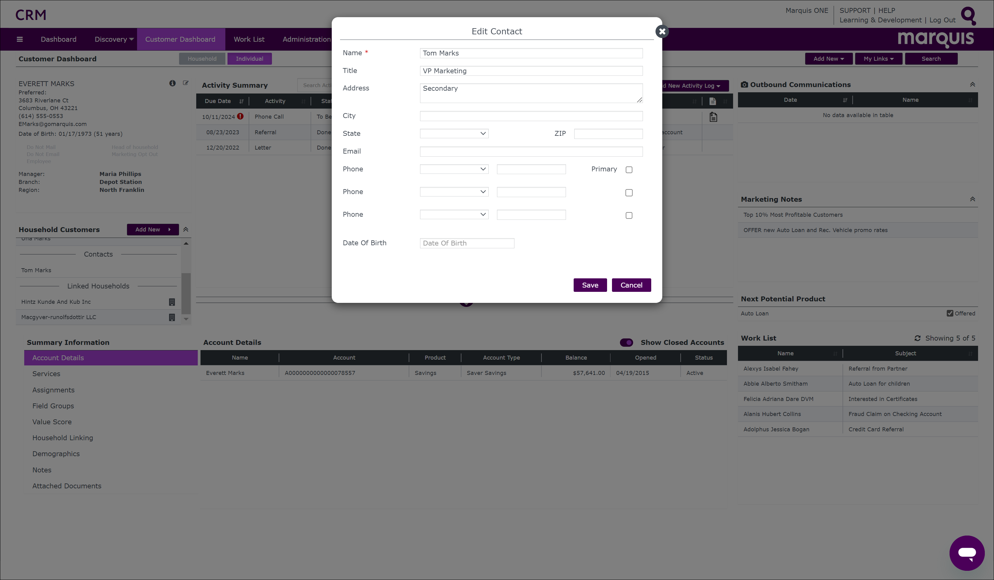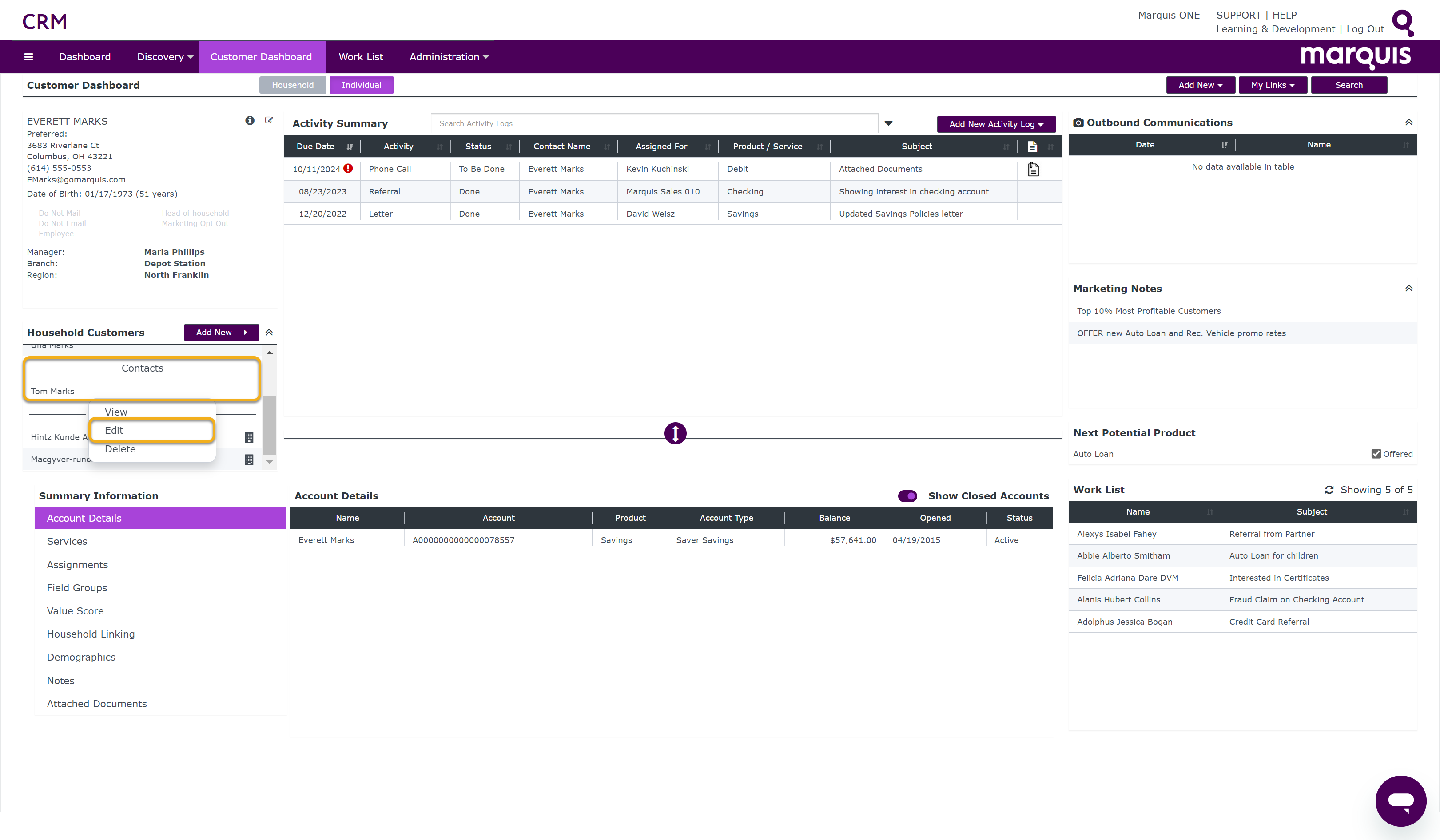 Step 6 To view a contact, click on the contact within the Household Customers box under the Contacts menu