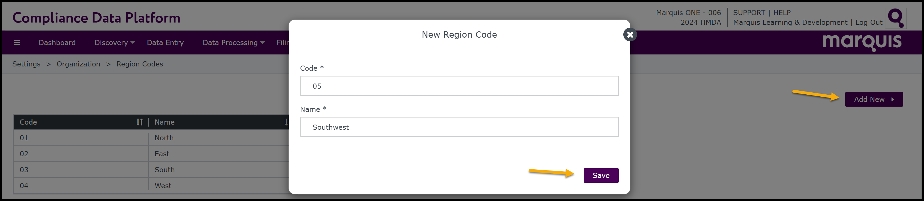 Step 5 To add a new Region code, click the green Add New button on the upper right-hand corner