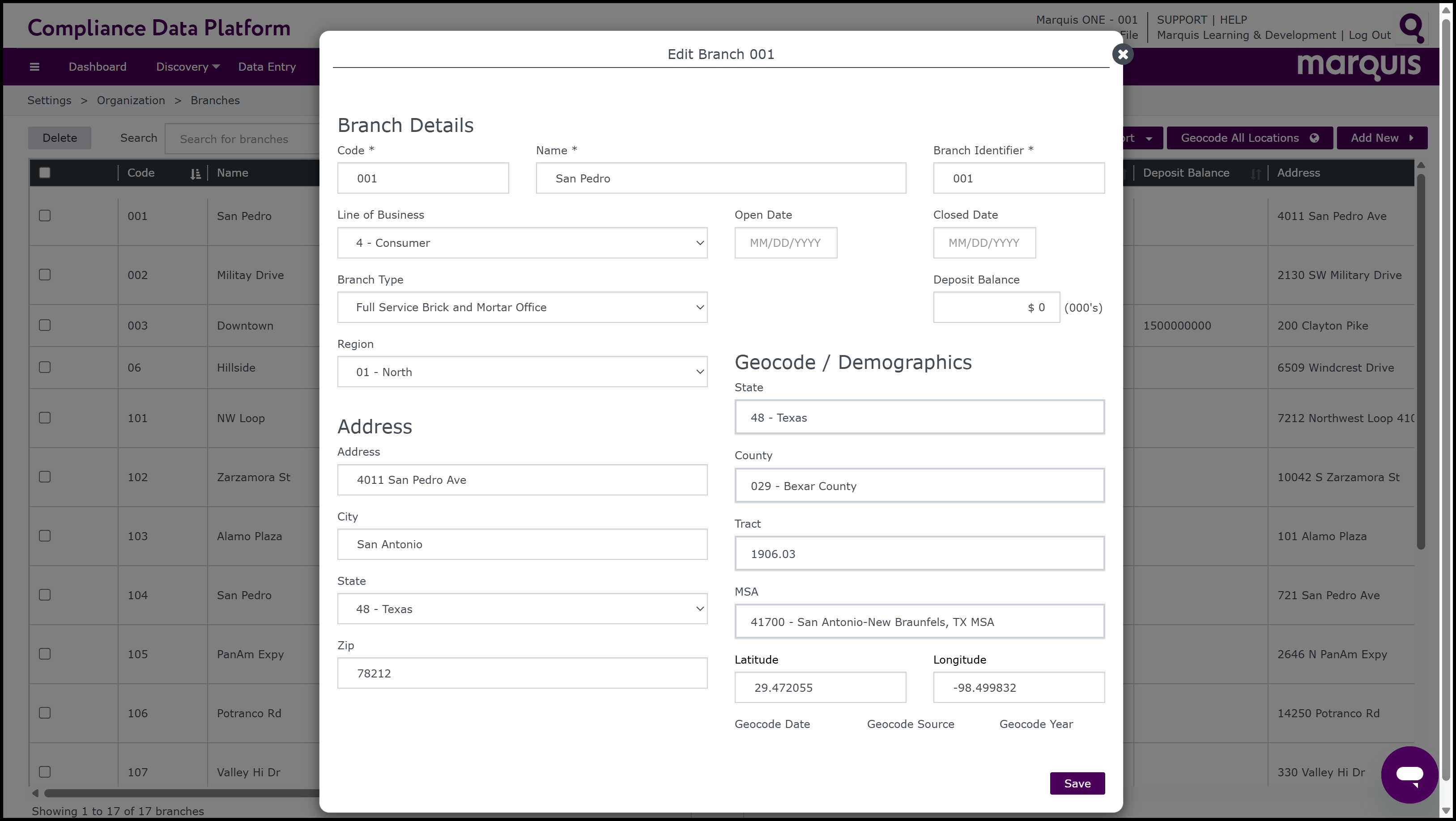 Branch Locations. Ensure the geocode, and date fields are accurate before running that report.