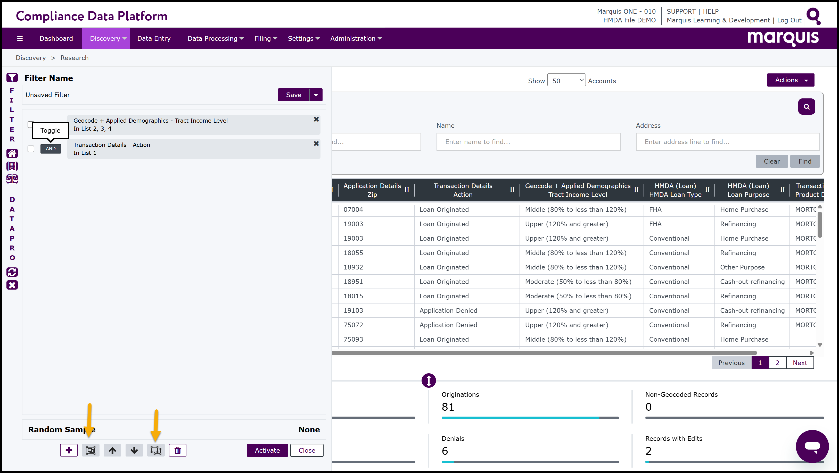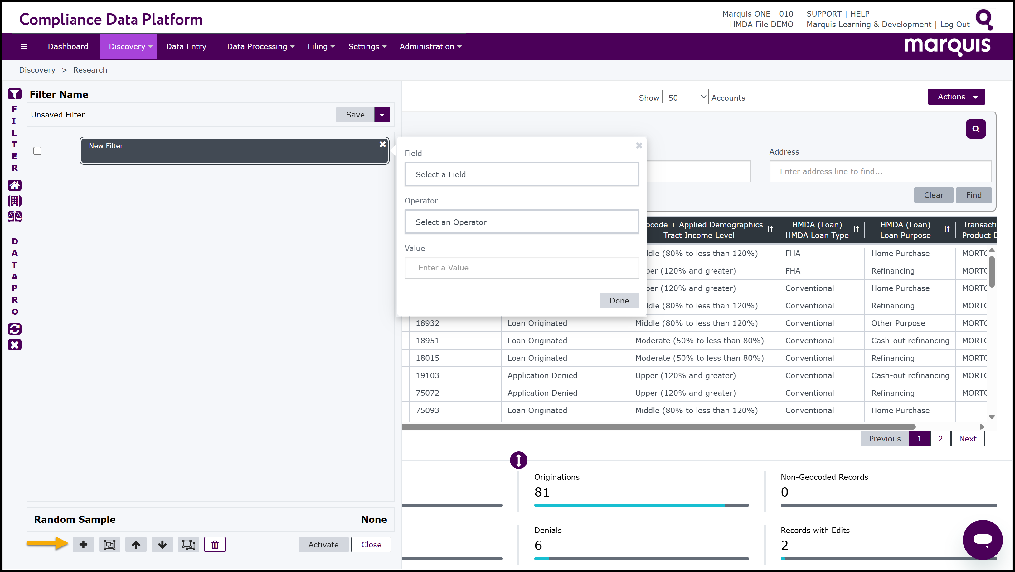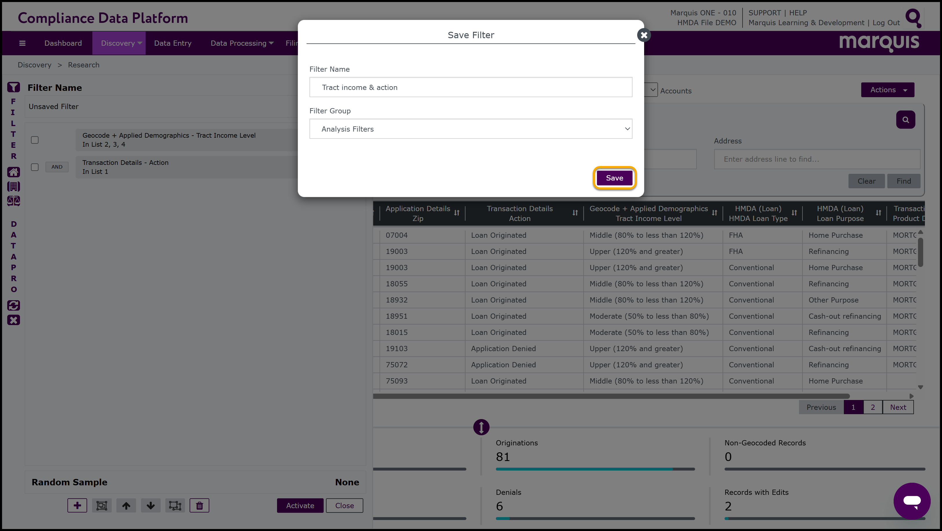 Note: the CDP also has short cuts to easily select and run filters. On the left-hand side of the Filter window, there are 3 Fast Filter buttons: Fast HMDA,