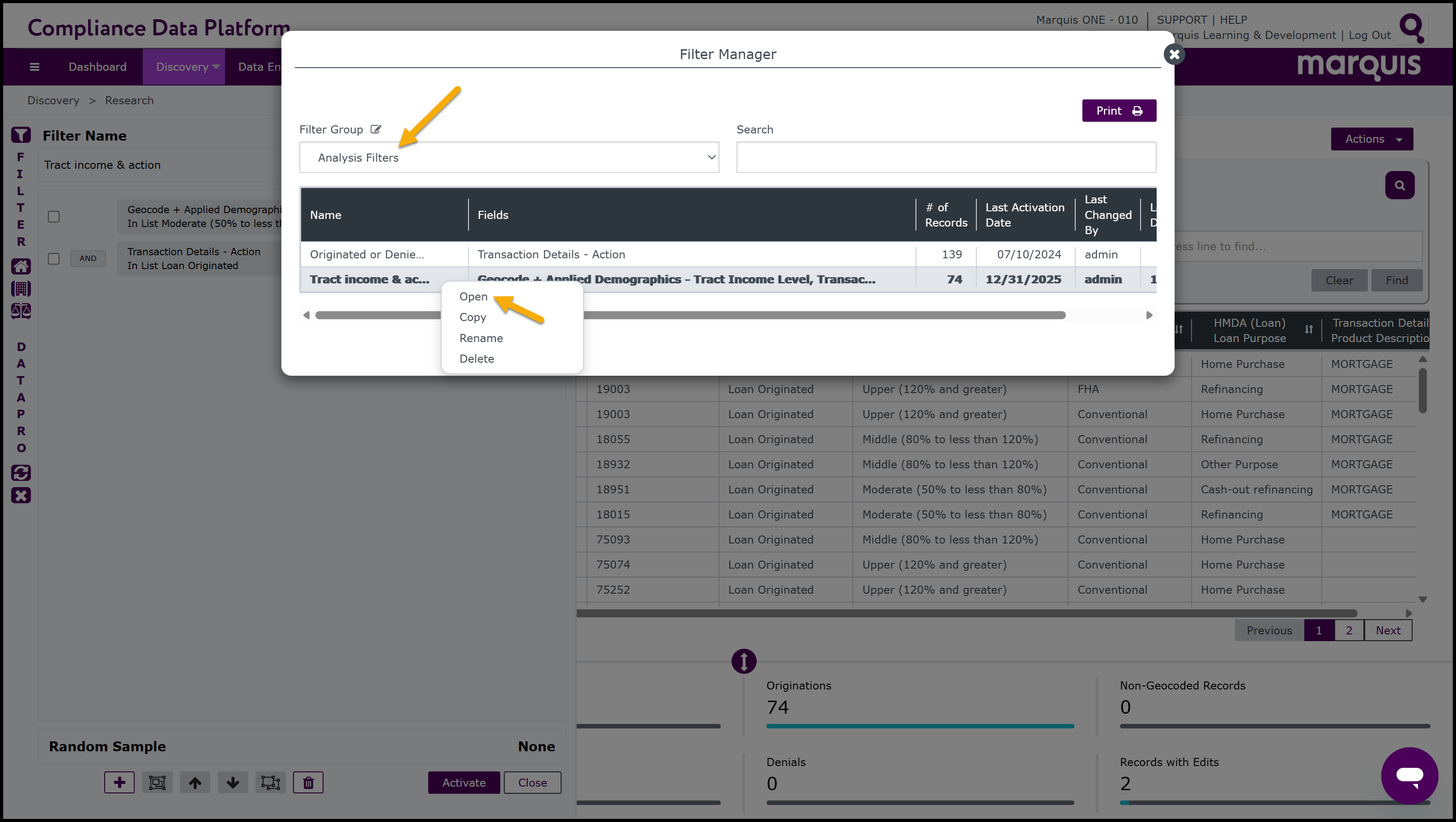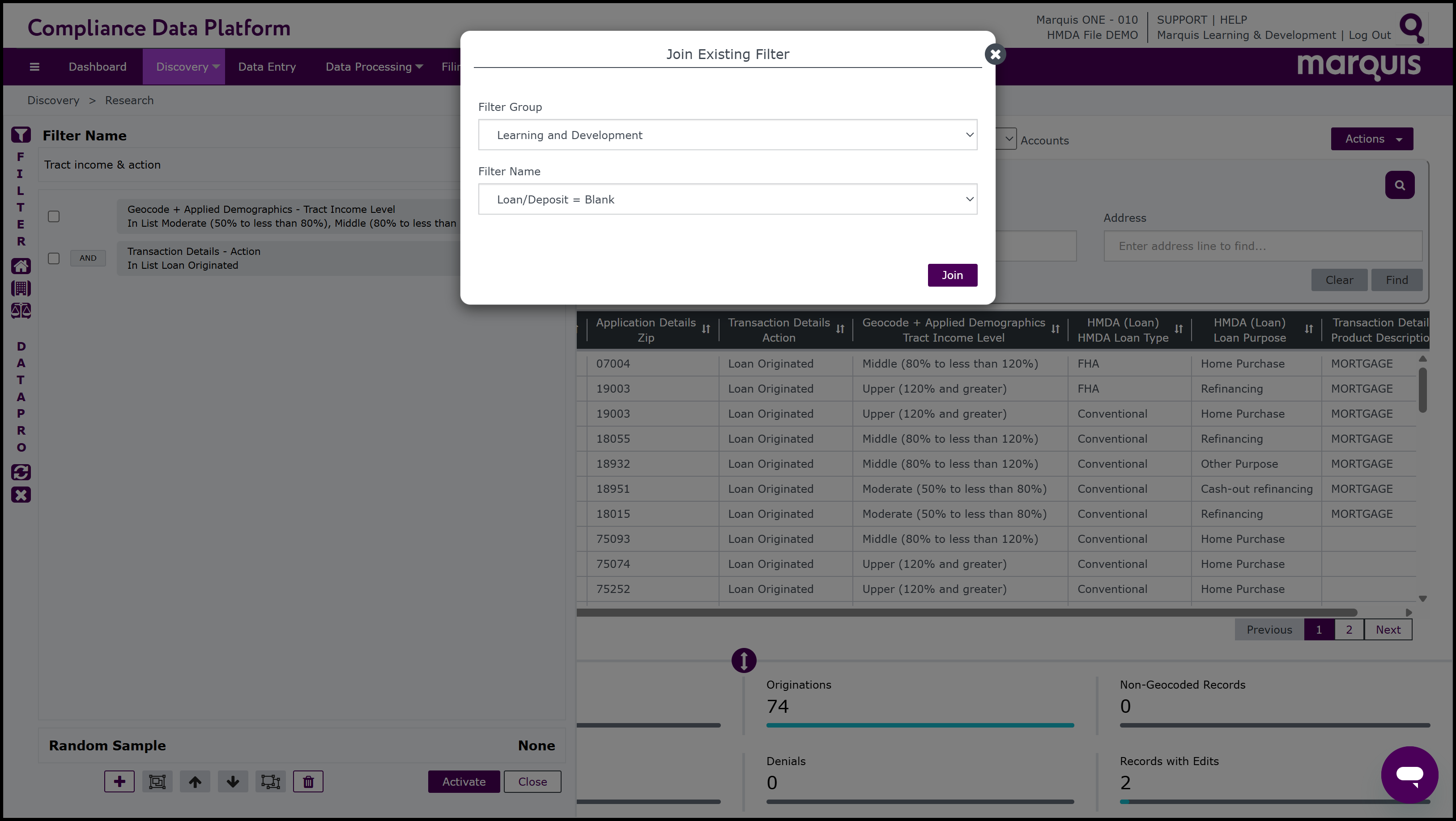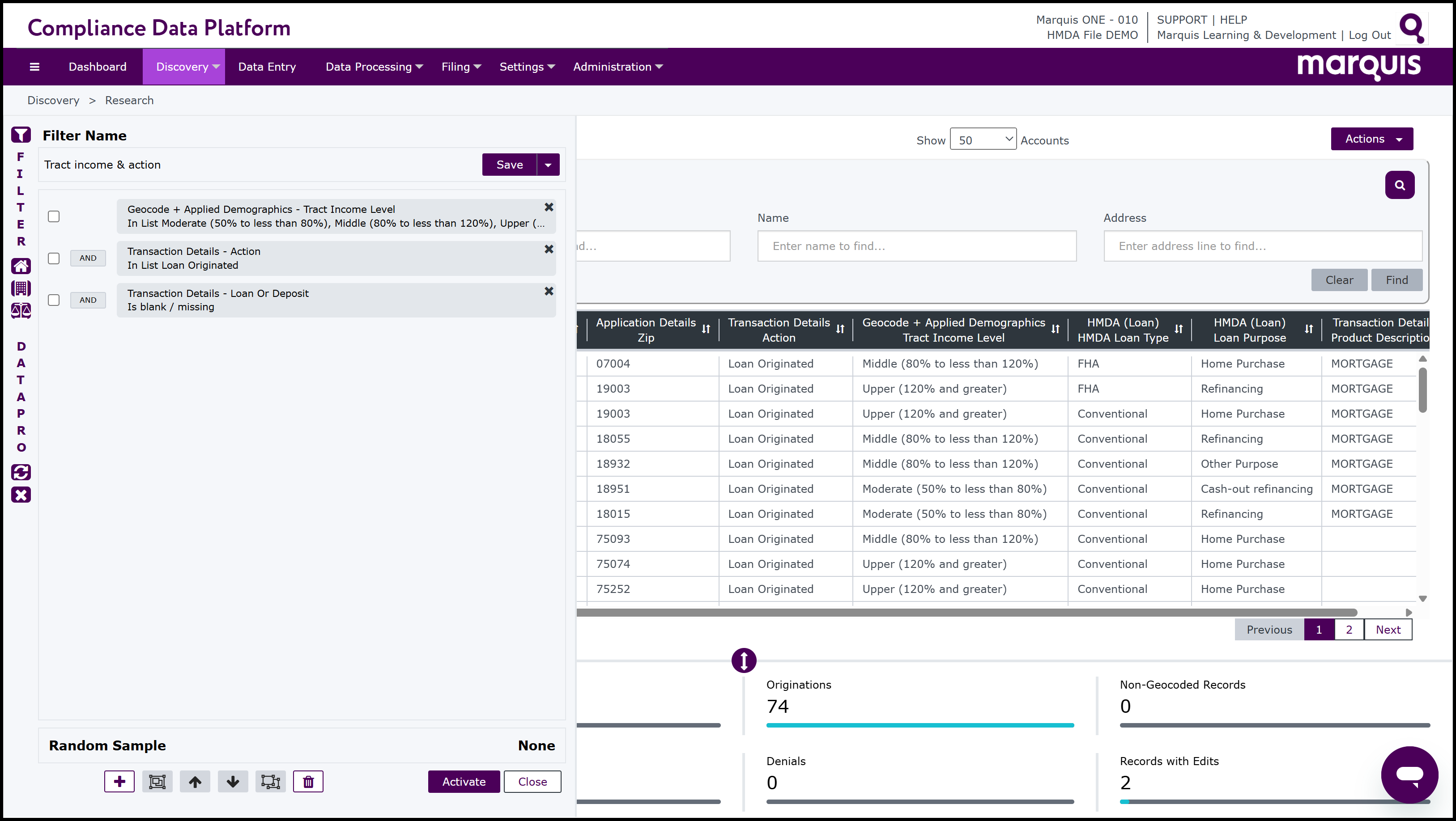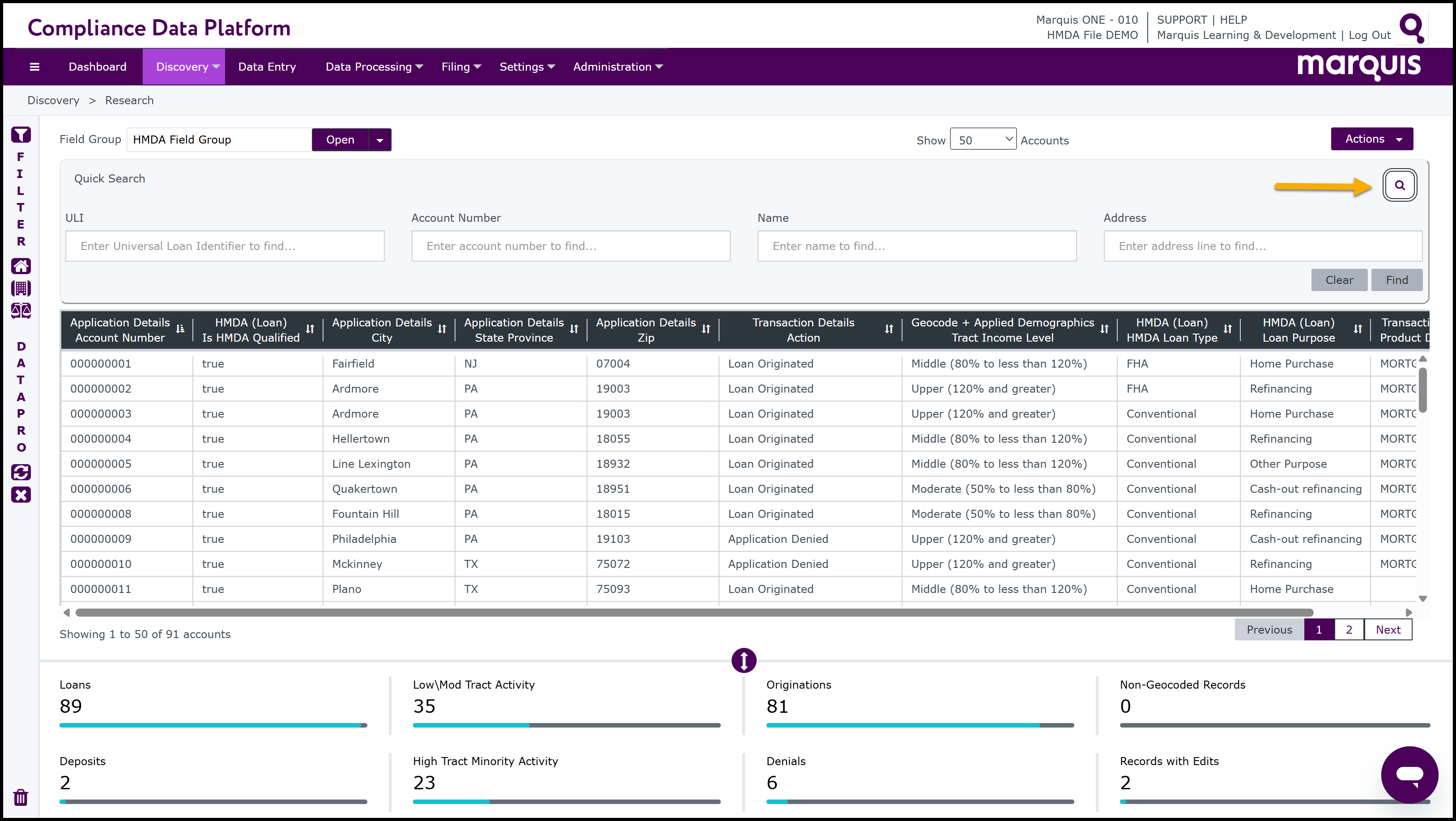 Note: the CDP also has short cuts to easily select and run filters. On the left-hand side of the Filter window, there are 3 Fast Filter buttons: Fast HMDA,