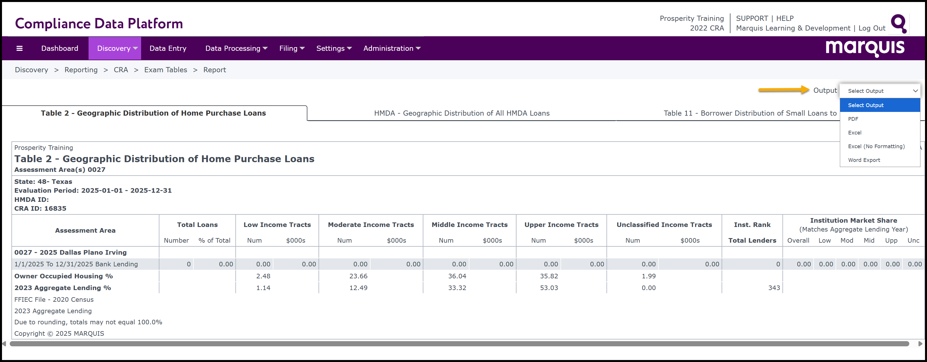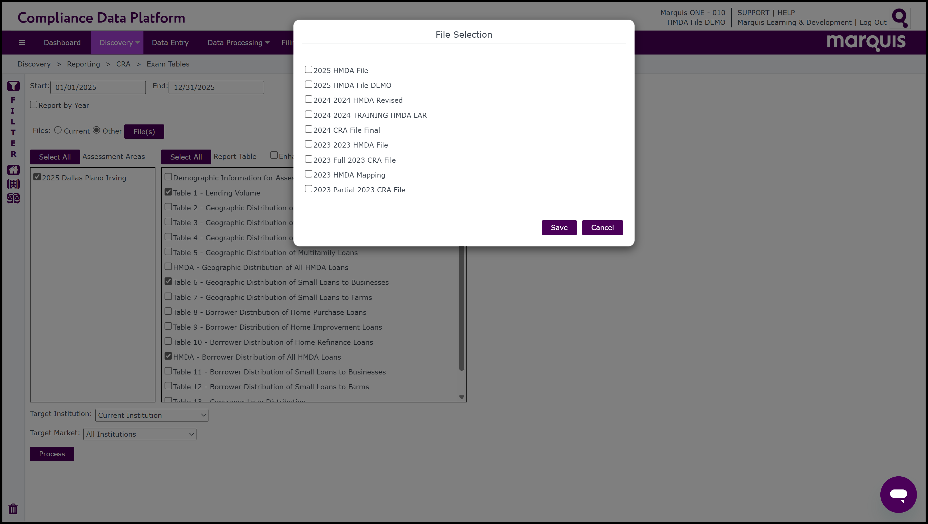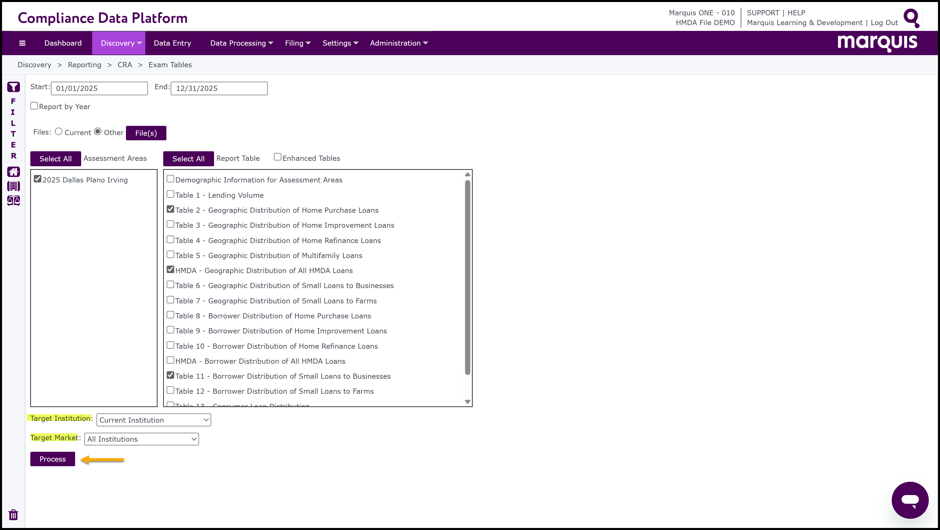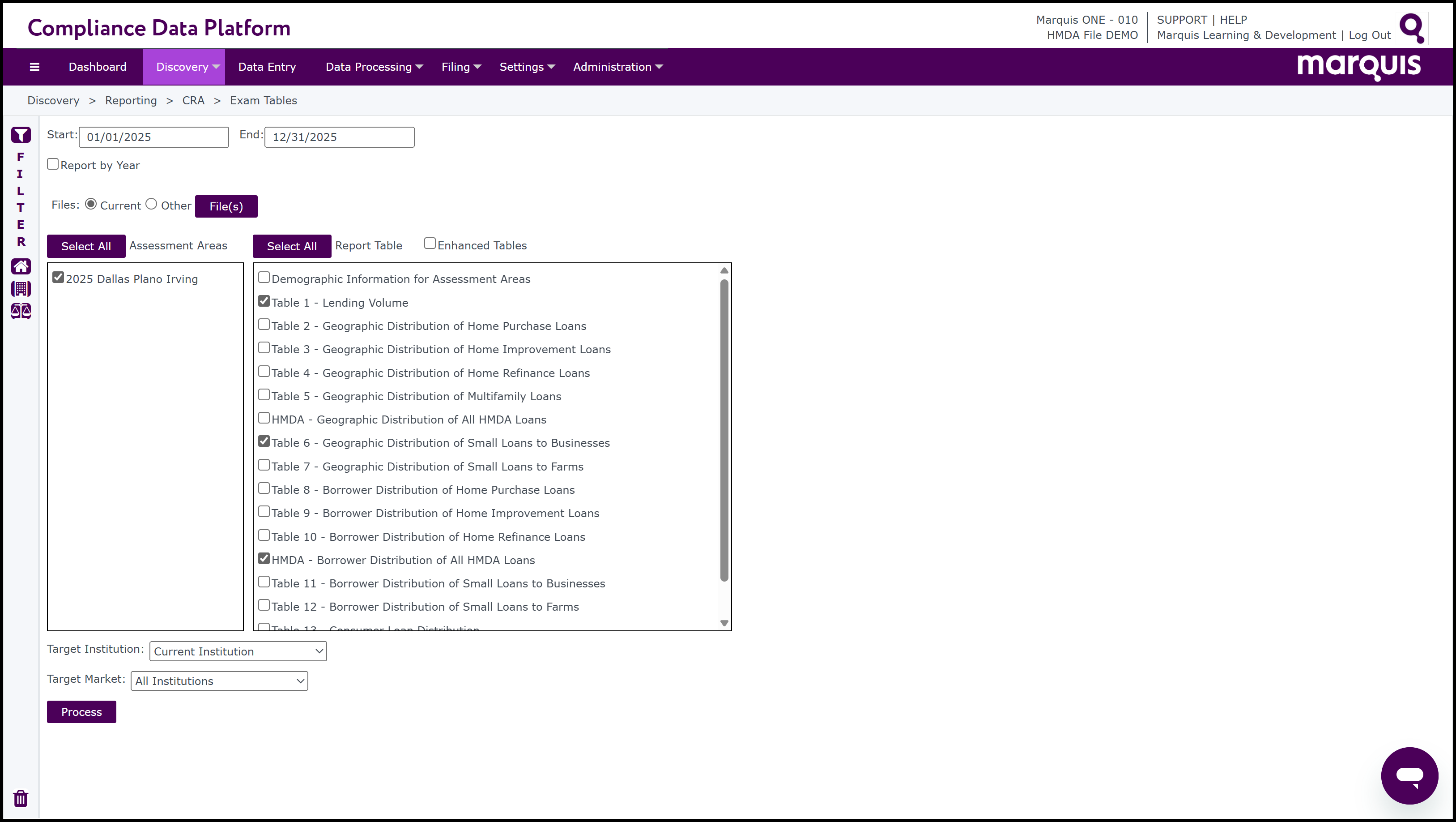 The Exam Tables are a set of reports which are commonly used by institutions to become “Exam Ready”. The tables can be processed for CRA and/or HMDA data. At least one Assessment Area must be selected when running the Exam Table reports.