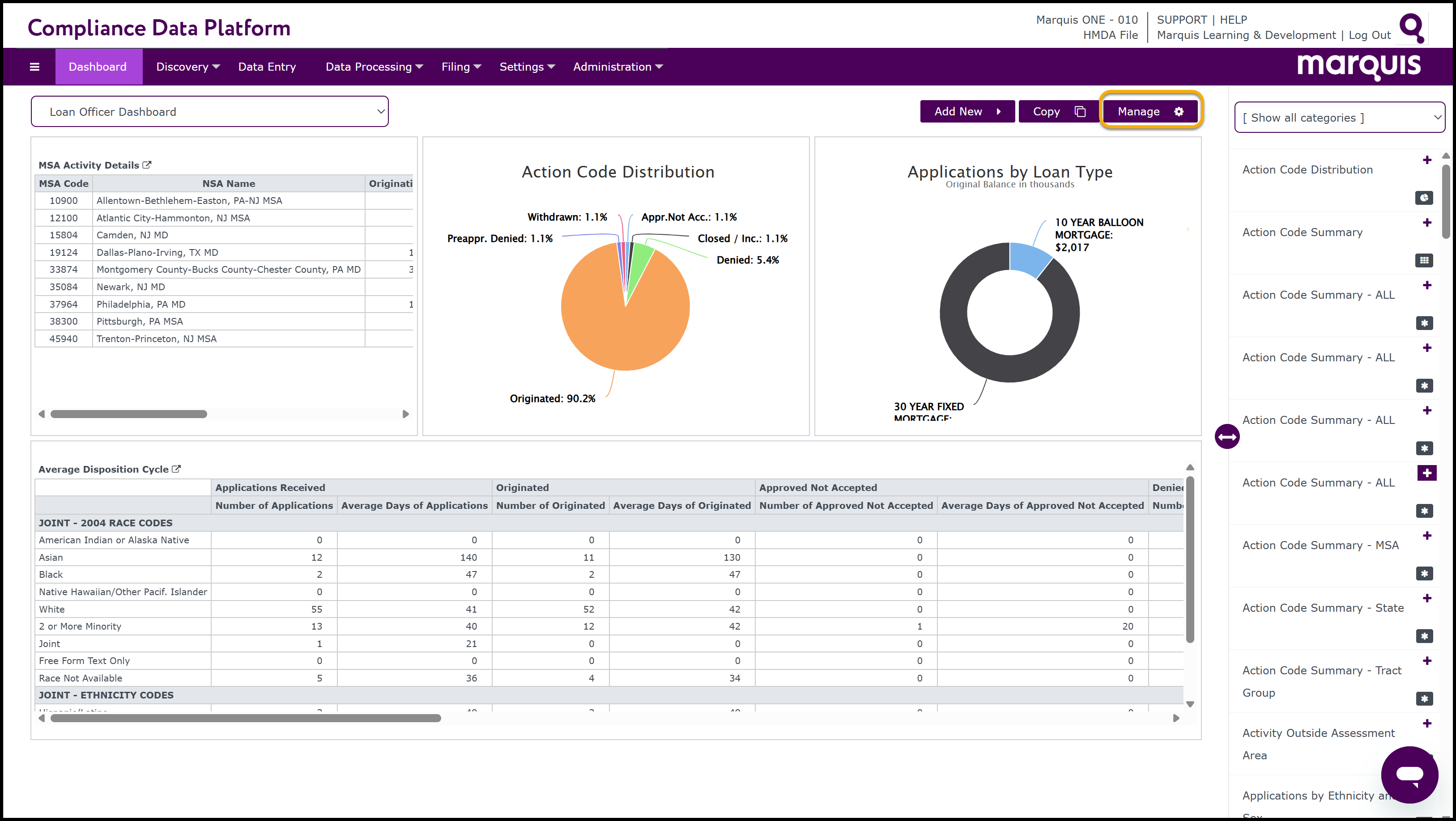 Note: The manage button is only available for Dashboards that were created by users (non-default Dashboards).