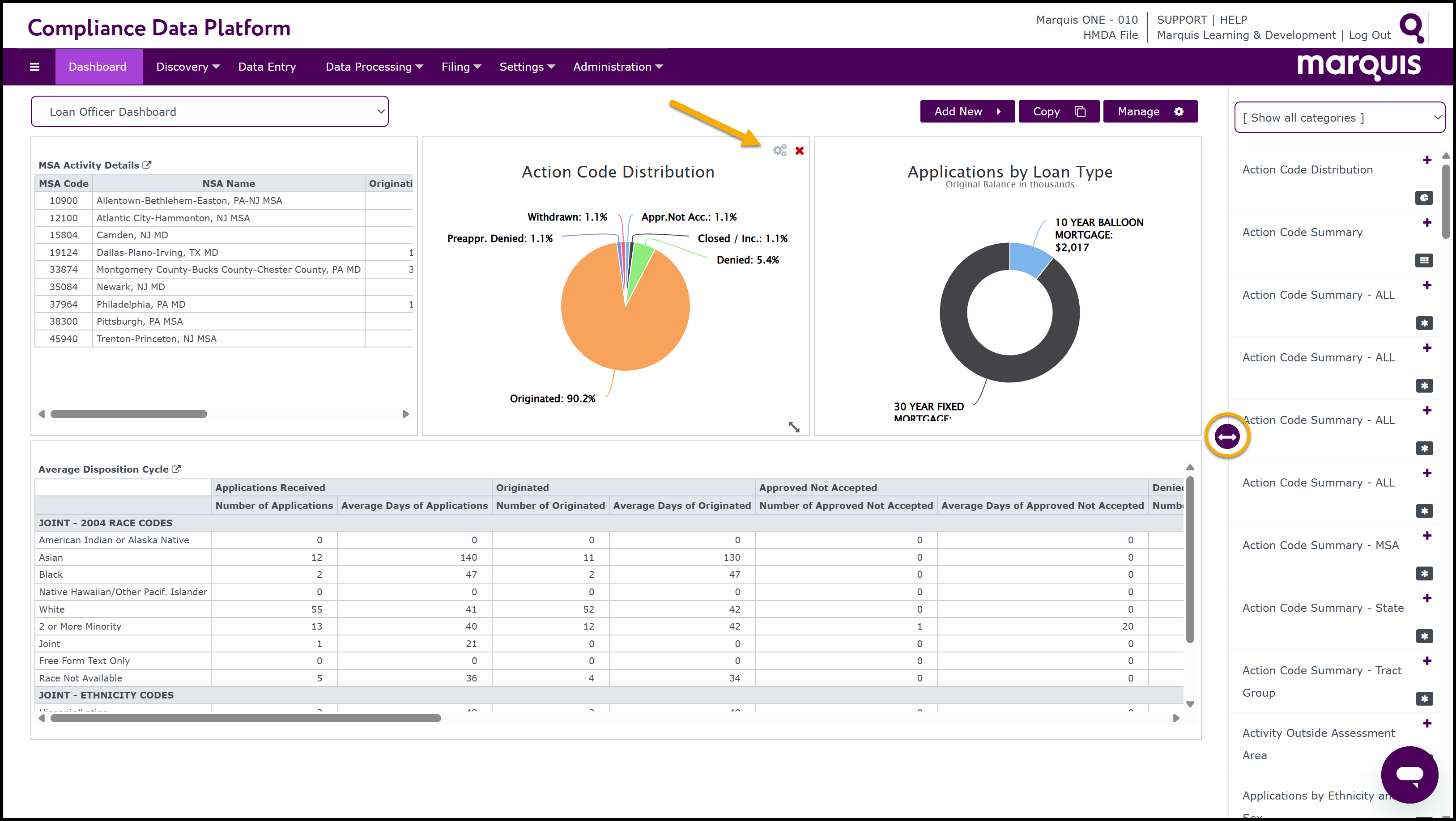Note: The Dashboard Elements Report library is located on the right hand side of the Dashboard page. It will only display when any Dashboard other than the default Dashboards are selected and when the assigned role of the user has permissions to modify and add dashboards. Click the horizontal arrow on the far right of the page to expand and collapse the Dashboard Elements library.