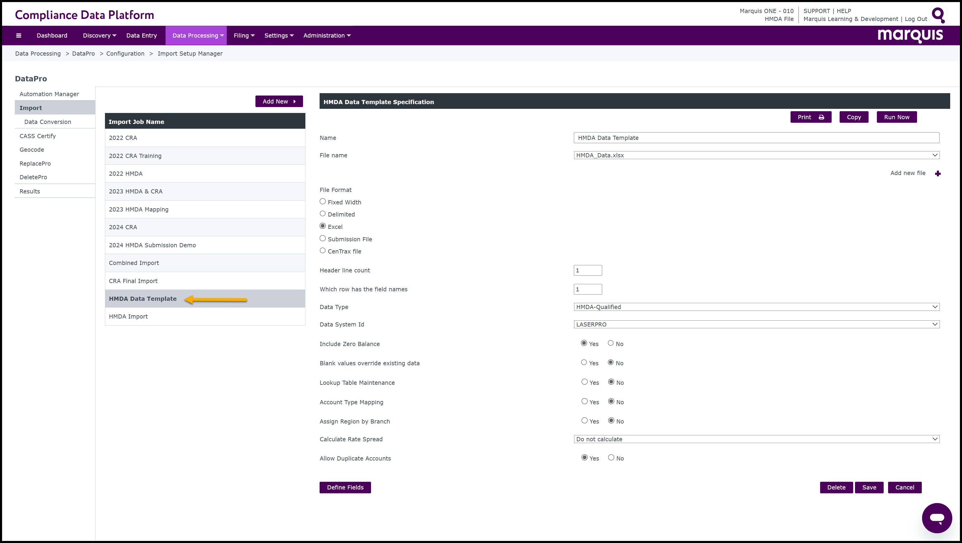 The Import section is used to define import layouts for files which will be brought into the CDP. Import layouts associate fields from a text, excel, or other file formats to place them in the appropriate locations to establish and/or update records. Once set up, import definitions may also be used within the automation process.
