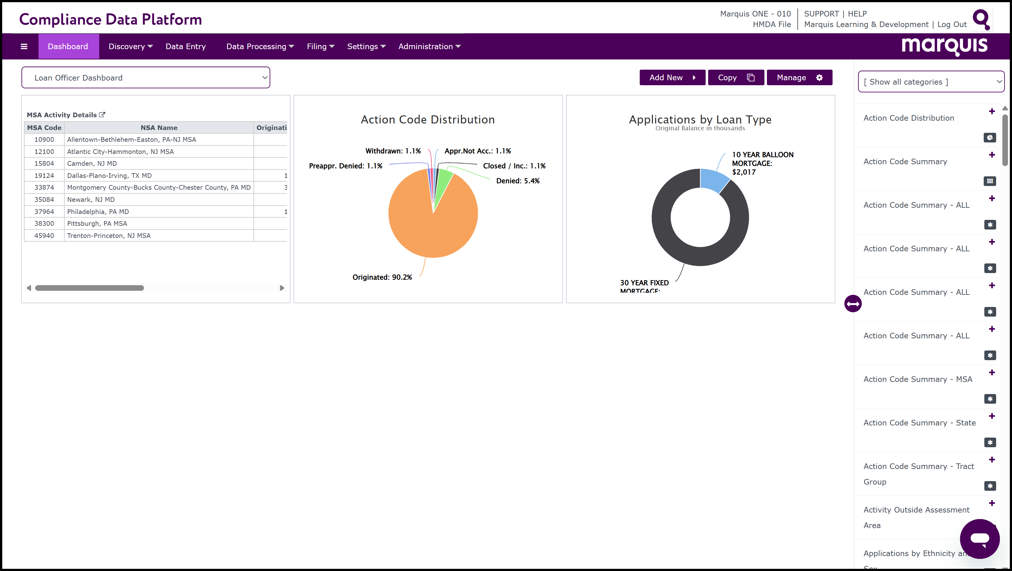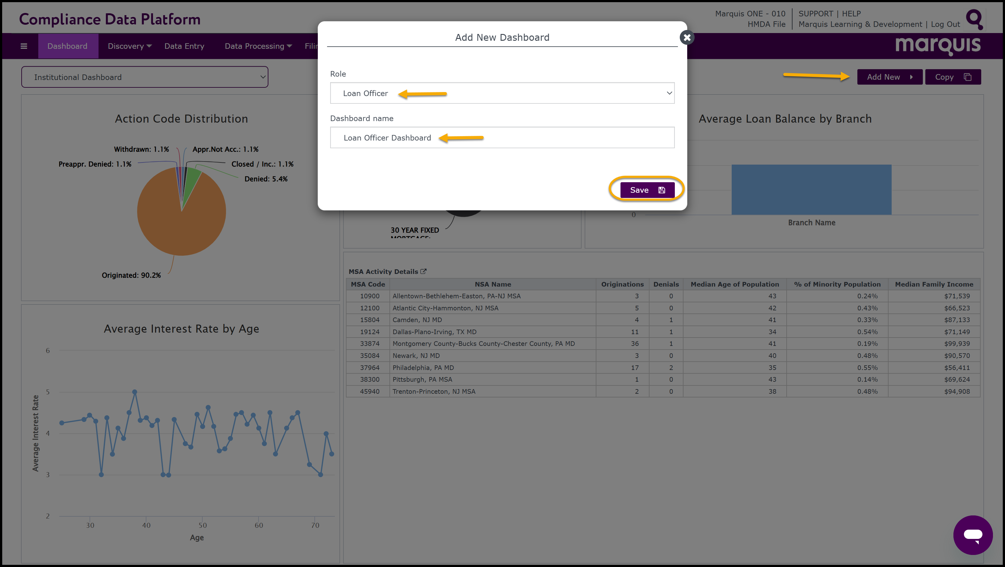 The Dashboard feature in the Compliance Data Platform allows for selected reports to be grouped and displayed for users based on their role within the system. They are designed to present the desired information based on current data when logging into the platform. This article explains how to create a new Dashboard.