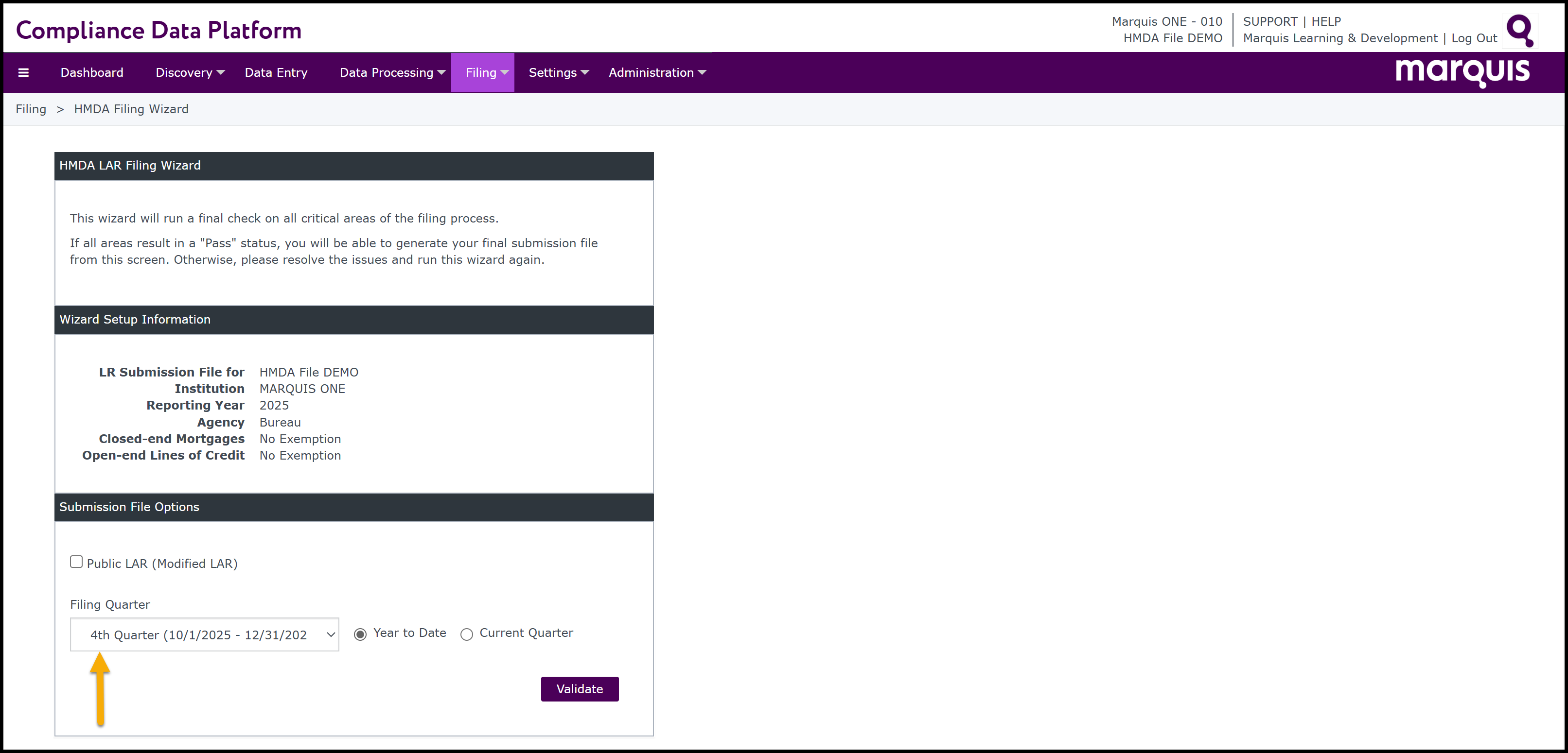 - Current Quarter – will validate for the current quarter selected from the Filing Quarter drop-down menu