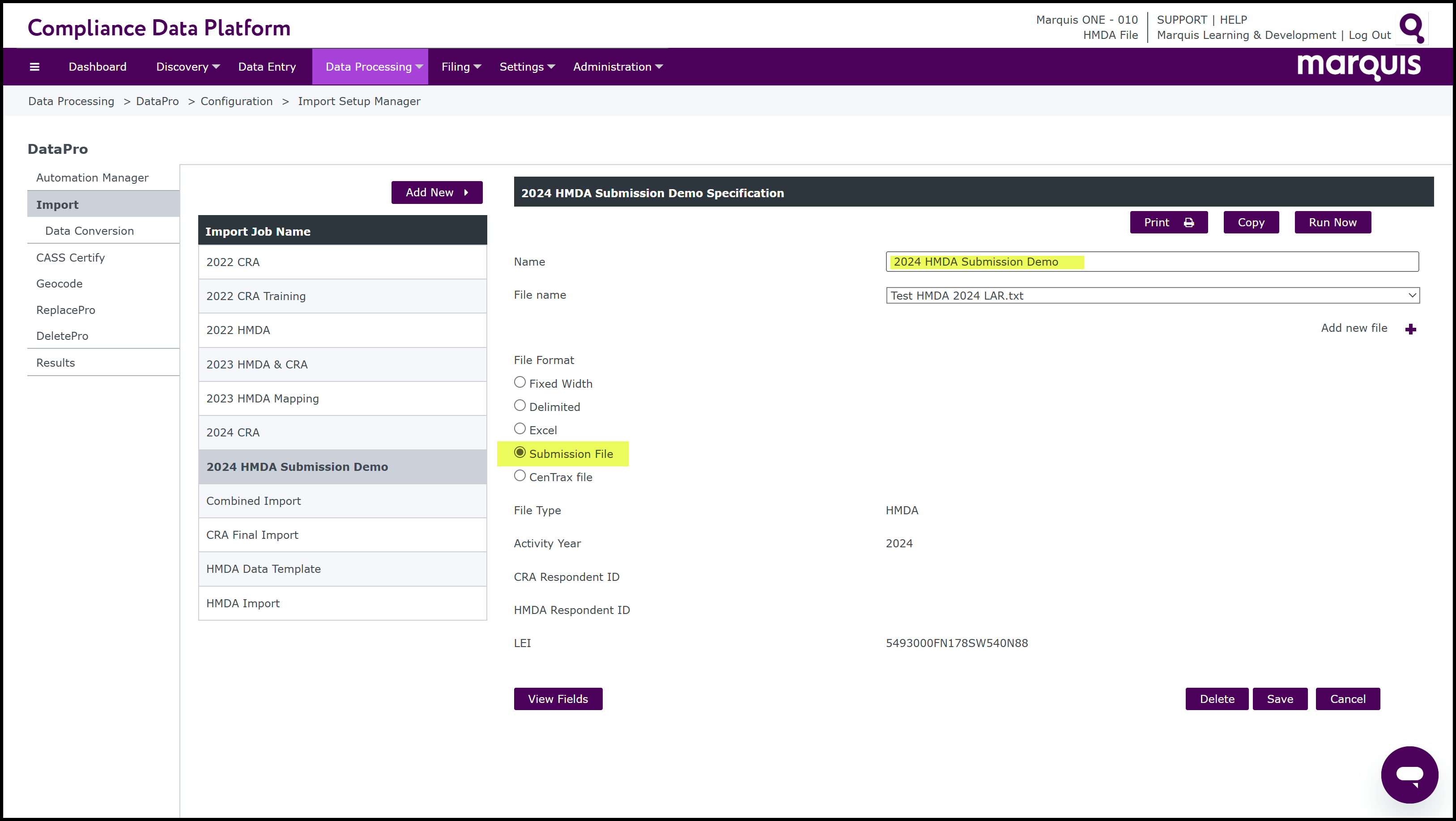 submission files. The following process outlines how to import in HMDA LAR or CRA LR submission files.