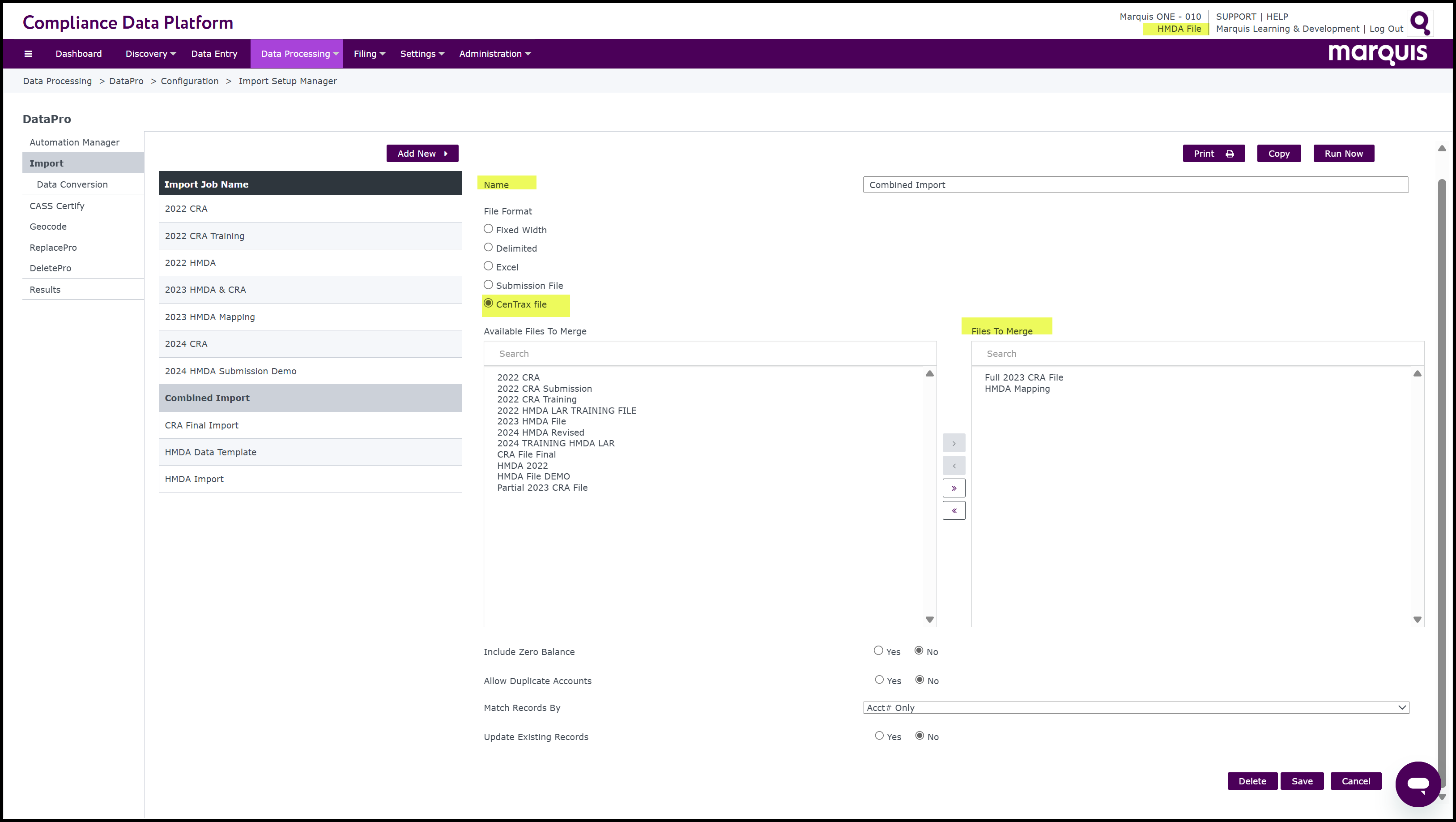 Once a file is imported into the Compliance Data Platform, it can function as a CenTrax file for the purposes of combining two imported files. The Import section is used to define import layouts that associate fields from certain file formats or another CenTrax file. The following process outlines how to import into a file from another.