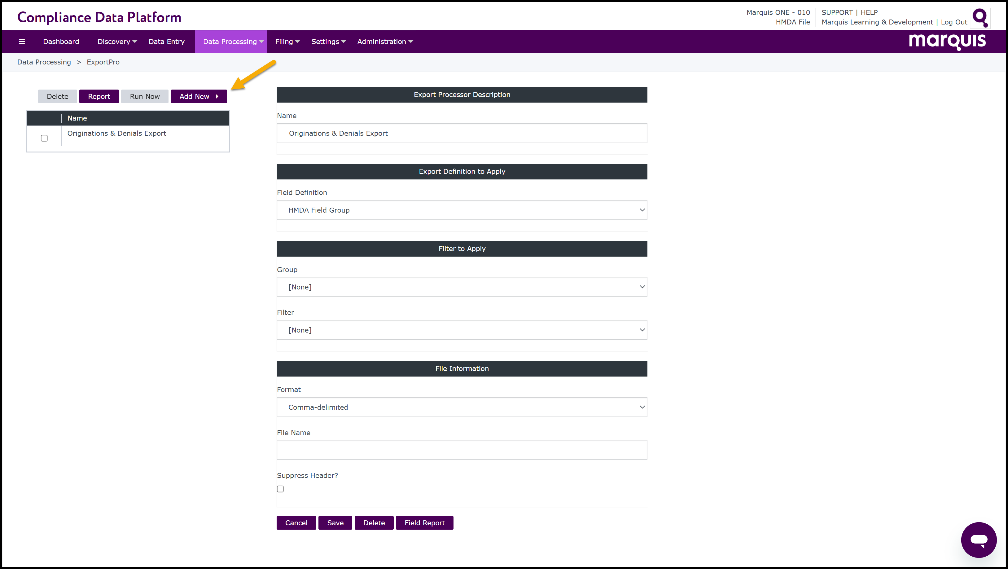 Step 4 To create a new ExportPro, click the Add New button