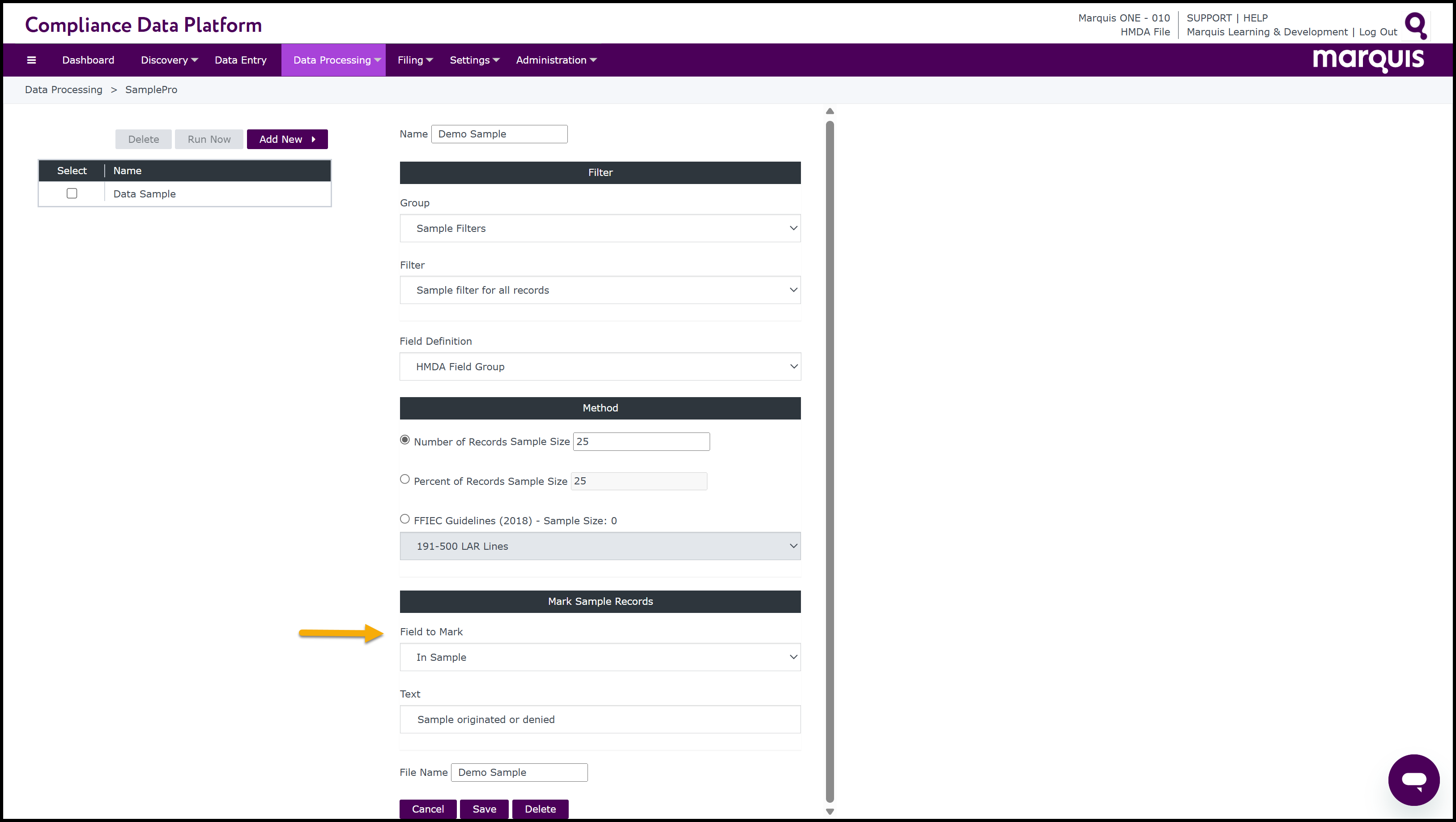 Step 9 Click the drop-down arrow for Field to Mark to choose a UDF to be flagged on records sampled (optional)