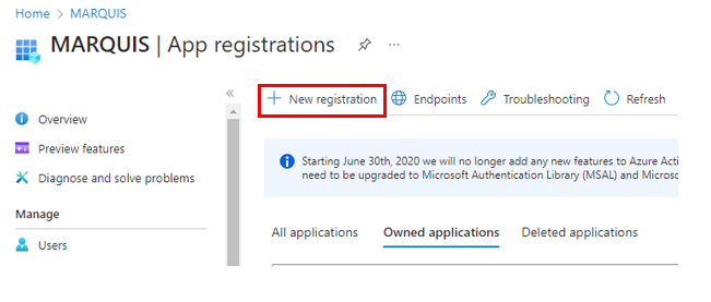 Once created, the client will be redirected to a similar screen as below. Have them click on the left navigation for the Authentication menu item. Also note there are 2 values here needed for the Marquis setup, Application (client) ID and Directory (tenant) ID. The values correspond to where they are needed in the setup.