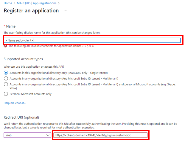 On the next page, have the client enter a meaningful name for this app registration and fill out the Redirect URL with the values Web and their domain going to the /identity/signin-customoidc, following the below example
