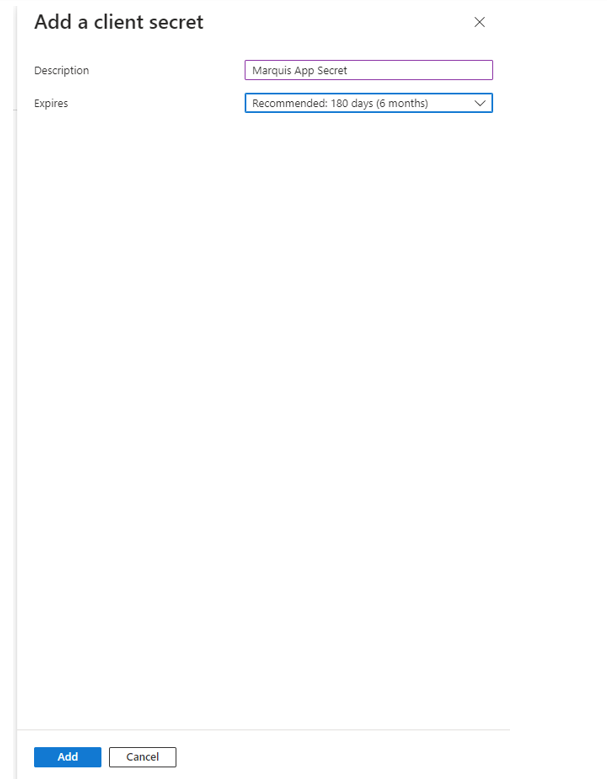 The last thing that needs to be configured is a secret. To do this, navigate to Certificates & secrets on the left navigation, and click on + New client secret. The below side menu will pop up, and only a meaningful name and time limit (set by the client) are needed. It is important for the client to note when the secret expires because a new secret will need to be created and added into the app at that point.