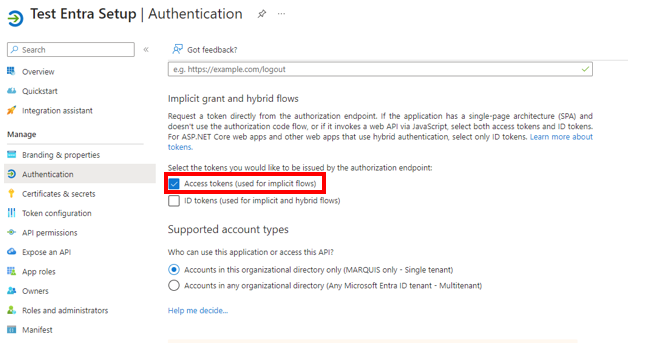 Once loaded, have them scroll down until they see 2 check boxes, one for Access Tokens and one for ID tokens. The Access Tokens box is the only one that should be checked.