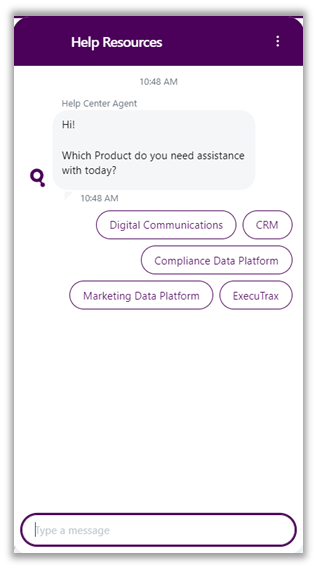 We are introducing a new interactive help chat button that enables the ability to ask a question and receive applicable help resources based on the question. Simply click the chat icon, and a chat window will display. Enter the question or information you are looking for, and it will return several resources that can be selected to review.