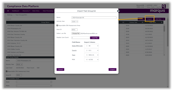 We are excited to introduce a new feature to import tract groups and assessment areas from a CSV file. This simplifies the process to create assessment areas, especially if your area is a partial county or partial MSA. An Import button is now located within the Tract Groups / AAs setup page within Compliance Data Platform.