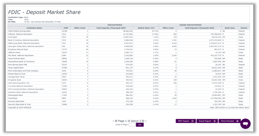 The FDIC Deposit Marketshare report is now available within the Compliance Data Platform. You now have the ability to generate the Deposit Marketshare report on your financial institution and that of your peers for analysis without needing to leave the Compliance Data Platform. Simply select the applicable time period, choose banks or holding companies, and click View Report. The report integrates directly with FDIC to pull the data and present it to you in a report. The report can be saved to Excel or PDF.