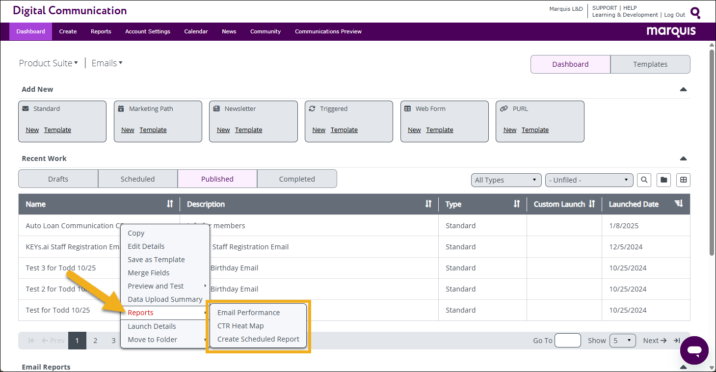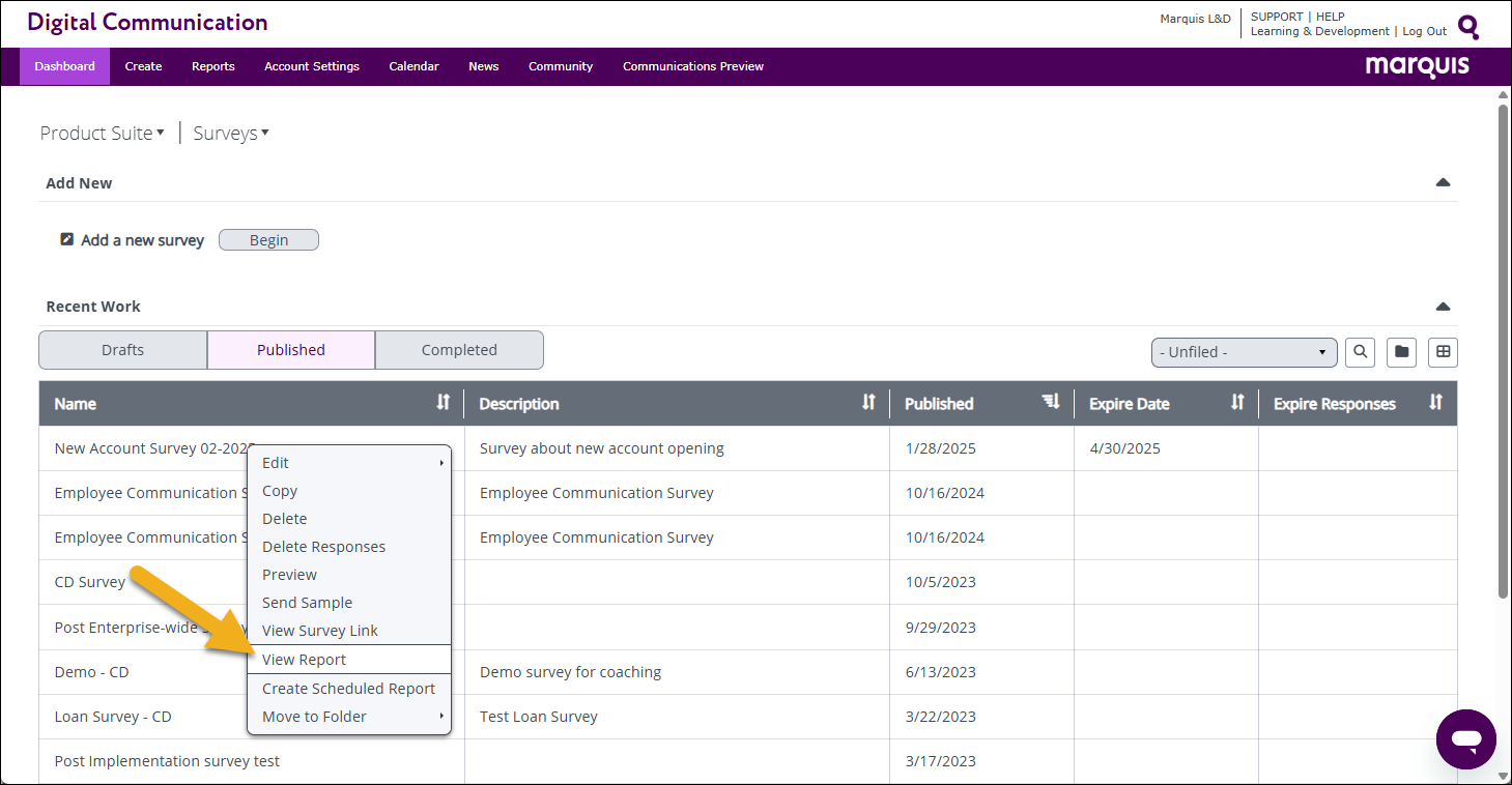 2. For reports that are specific for an email, survey, etc., the report is viewed by selecting the View Report option within the Published tab (for Emails, Surveys, etc).