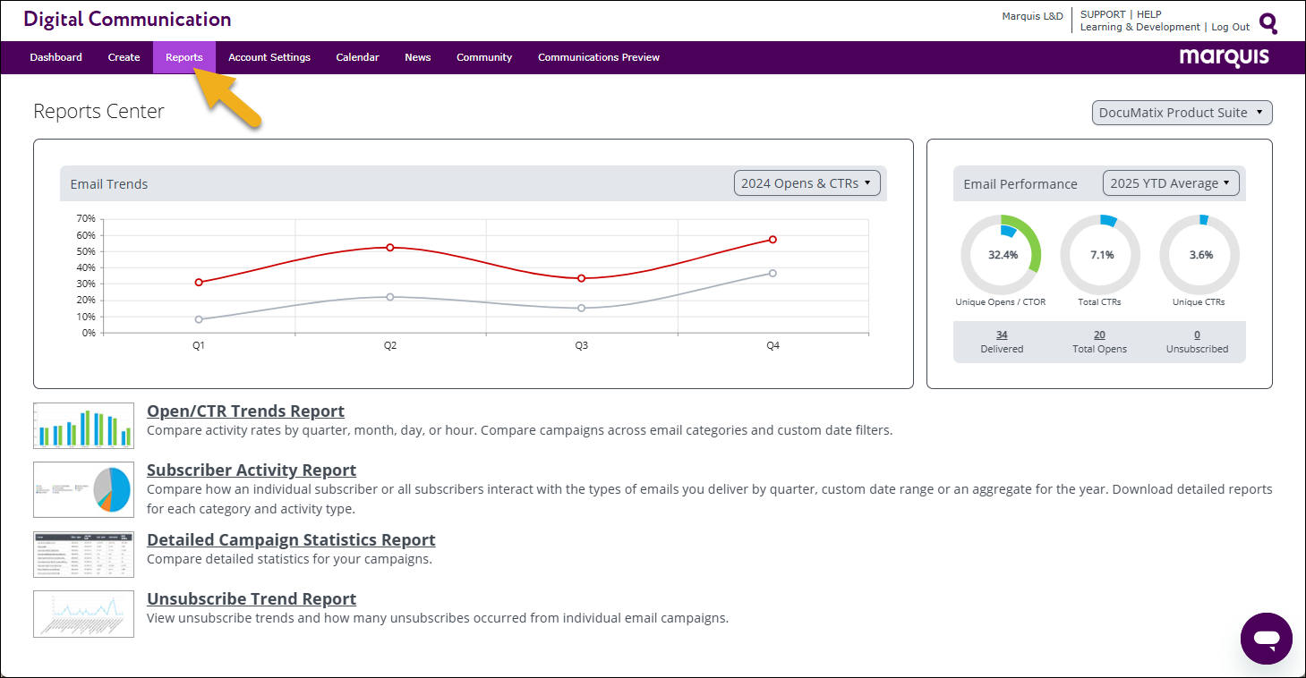1. Reports are accessible on the Dashboard using the reports widgets, and a chart on the Emails dashboard which displays open and click through trends for email launches.