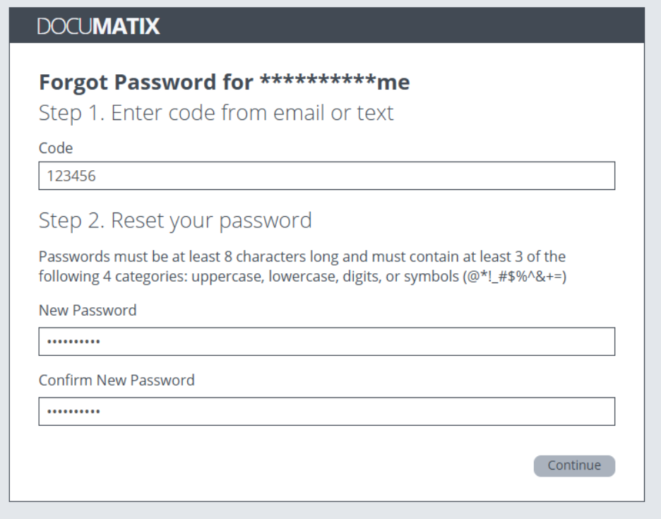 - Select Continue to set your new password.