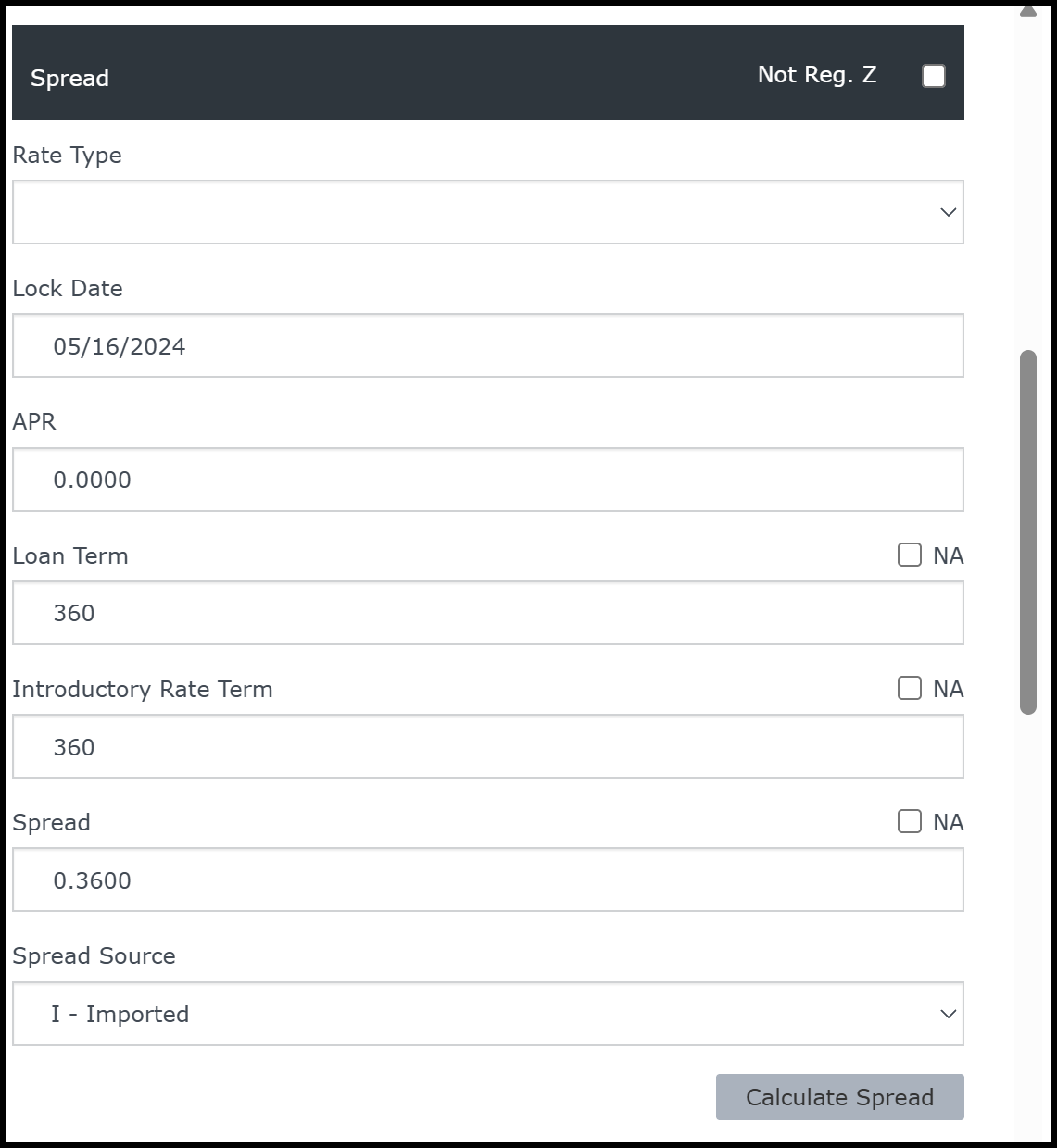 Rate Spread is the difference between the interest rate a bank earns (lending) and the interest rate it pays (deposits); and serves as a key indicator of a bank’s financial health. The following information is needed to calculate the Rate Spread: Term/Introductory Rate Term, APR, Rate Lock Date, and the Fixed / Variable Rate indicator. If any of these fields are blank or invalid, the spread will not calculate.