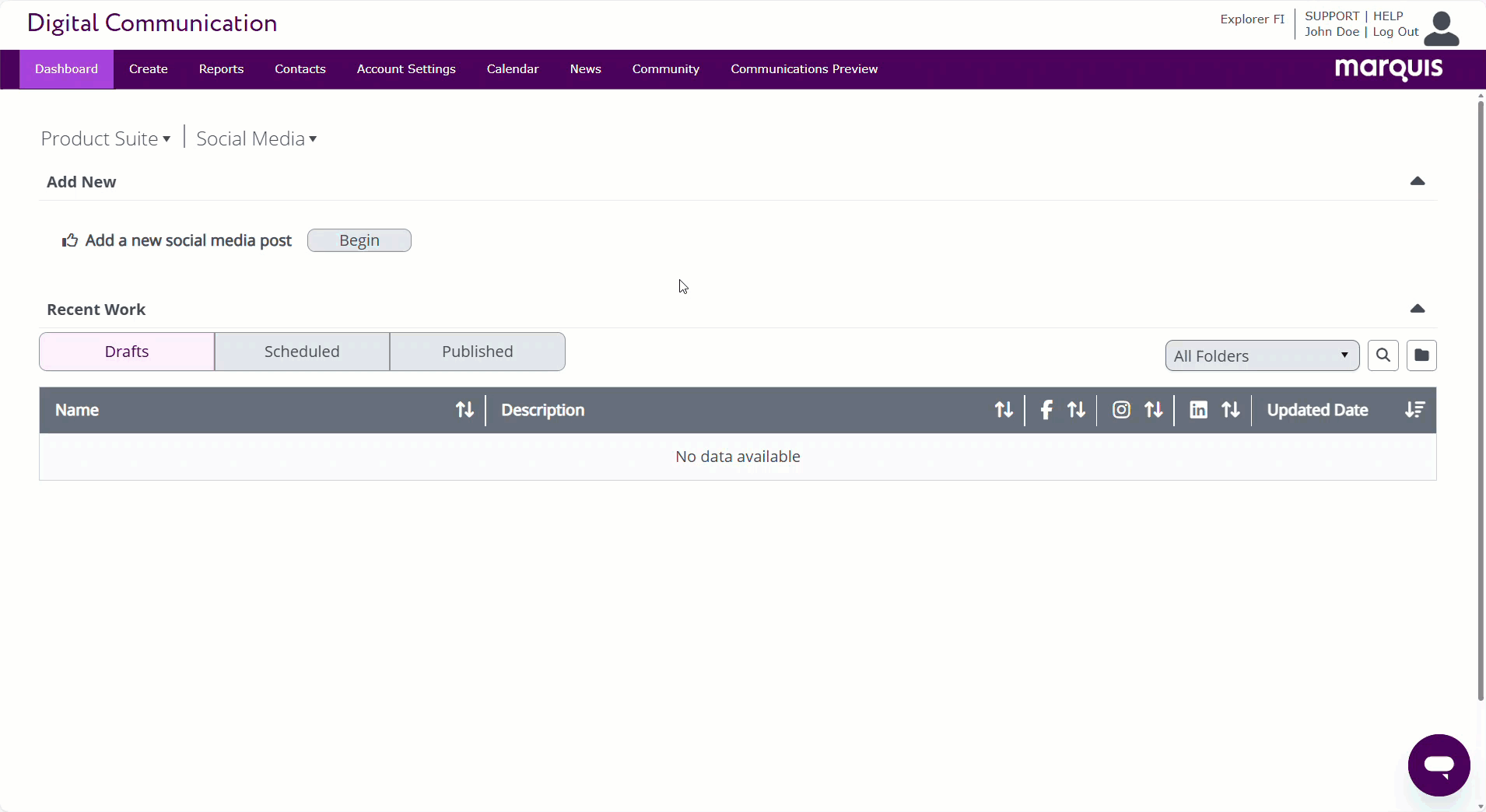 Drafts, scheduled posts, and publishing status can all be viewed directly from the Social Media dashboard.