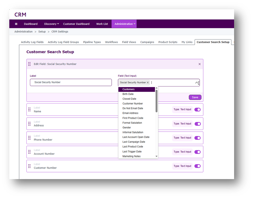 If you are no longer using Social Security Number under the Search on the Customer Dashboard to locate Customers, now you can change it to a different field you use. Maybe Customer Birth Date is a better option, or if you have a Customer user defined field that is more suitable, simply modify the field under CRM Settings with the Customer level field of your choosing.